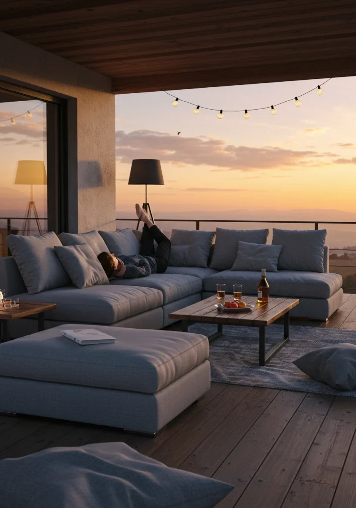 To create a truly cozy and layered lighting scheme that mimics an indoor living room, go beyond just overhead string lights and incorporate outdoor-safe table lamps and floor lamps. This is a design detail that can make your outdoor space feel incredibly finished and sophisticated. A beautiful lamp on a side table or a floor lamp next to an armchair provides a warm, low-level, intimate glow that is perfect for reading or conversation.