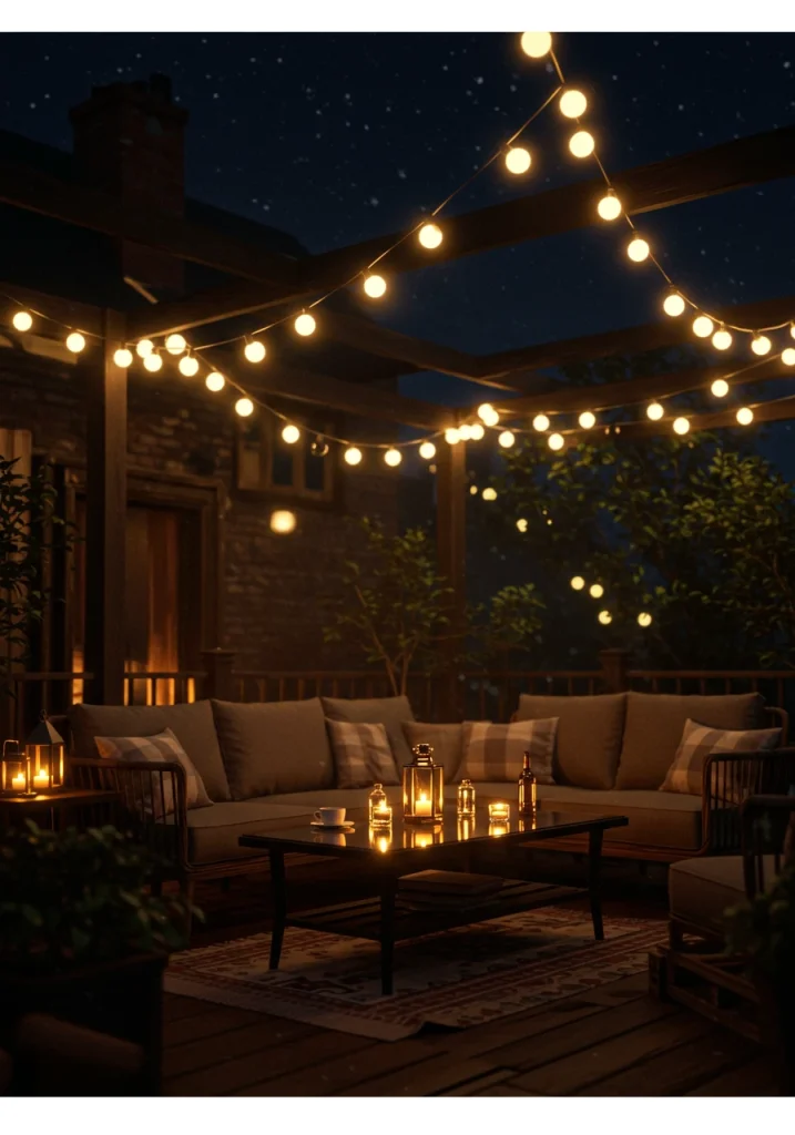 Good lighting is essential for creating a warm and inviting atmosphere in your outdoor living room after the sun goes down. The most effective and popular way to create a magical, cozy ambiance is with overhead string lights. A simple strand of warm, glowing lights can completely transform the space, making it feel like an intimate, European bistro or a whimsical, starlit retreat.