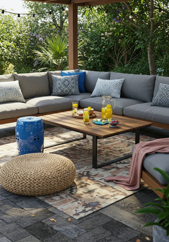 Outdoor poufs, which are essentially large, sturdy, weather-resistant floor cushions, are fantastic for adding a casual, bohemian vibe. They are great as footrests or as low, comfortable seating, especially for kids. I love to scatter a few around a coffee table to encourage a relaxed, informal atmosphere.