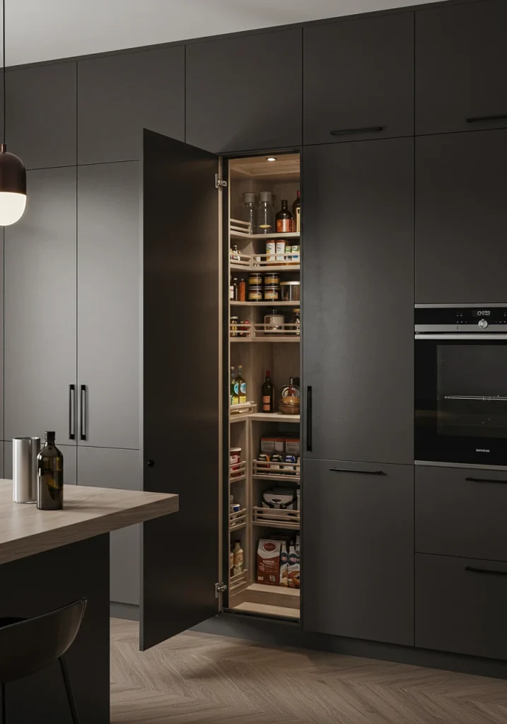 The Space-Saving Cabinet Pantry: A tall, integrated kitchen cabinet with pull-out shelves and drawers, perfect for smaller kitchens.