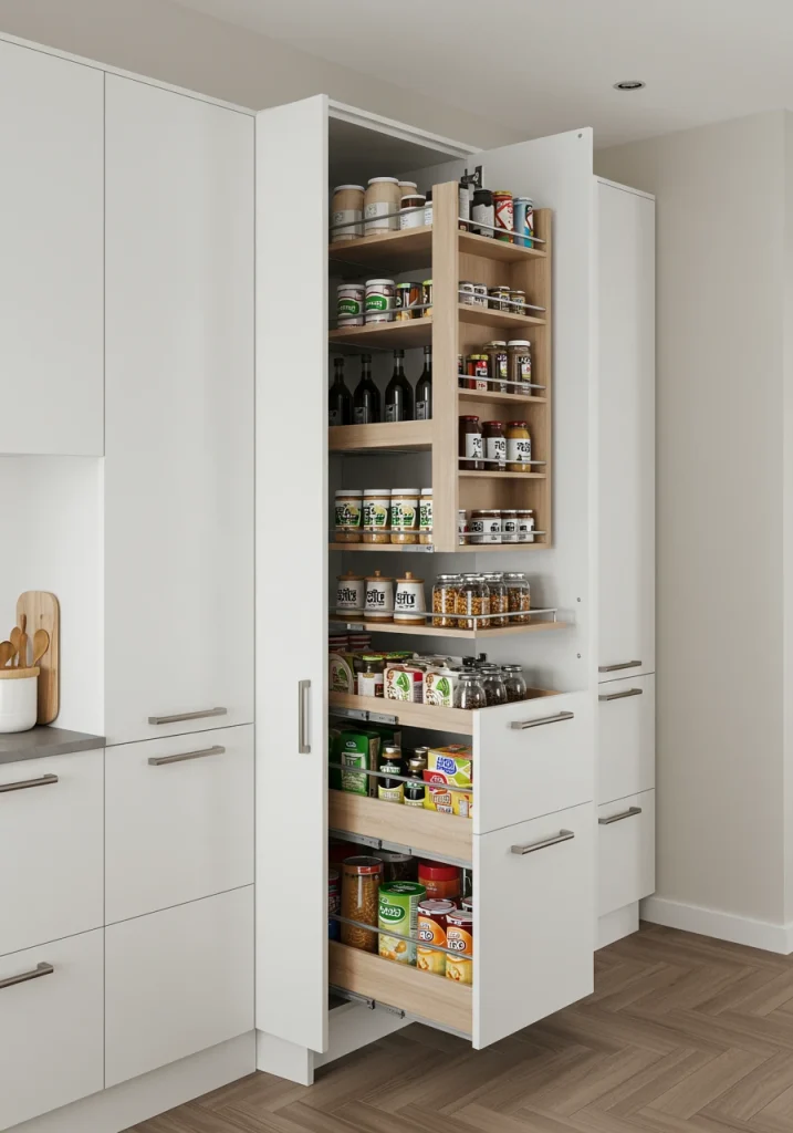 Pull-Out Drawers and Shelves: A game-changer for deep shelves, allowing you to bring the entire contents out to you.