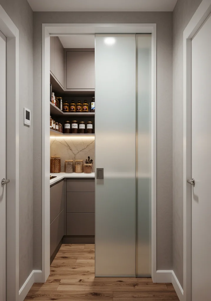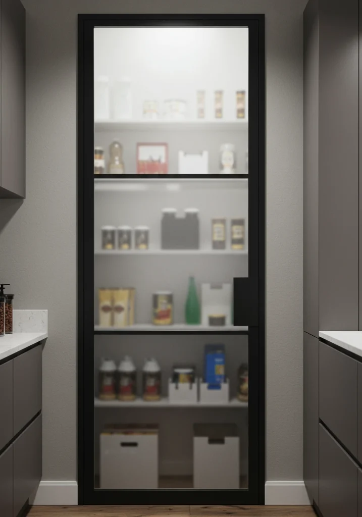 The Frosted Glass Door: Hides any visual clutter on the shelves while still allowing light to pass through, preventing the pantry from feeling too dark.
