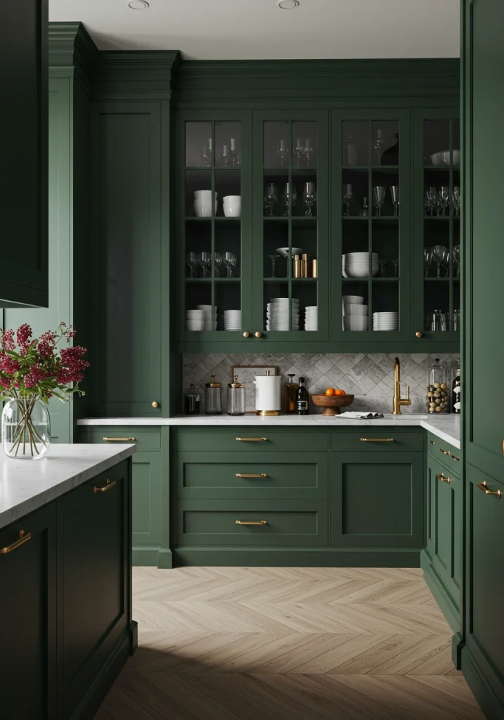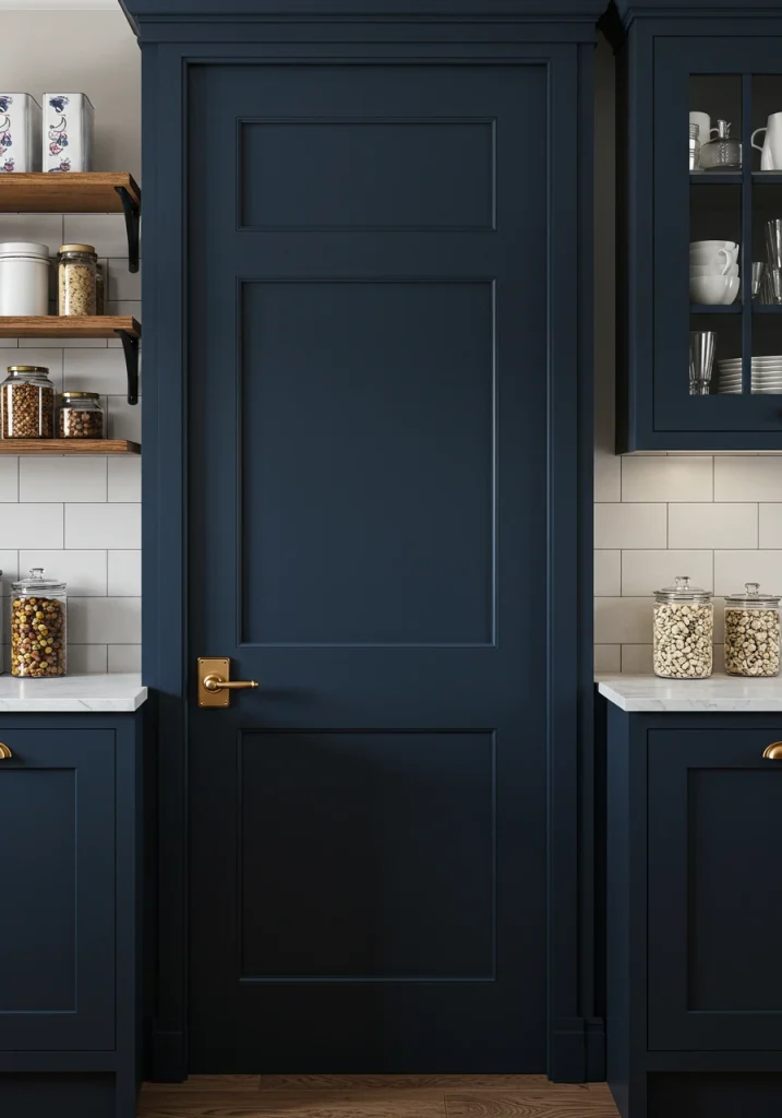 A Bold, Painted Cabinet Color: Painting your pantry a deep, unexpected color like navy blue or forest green is a huge trend.