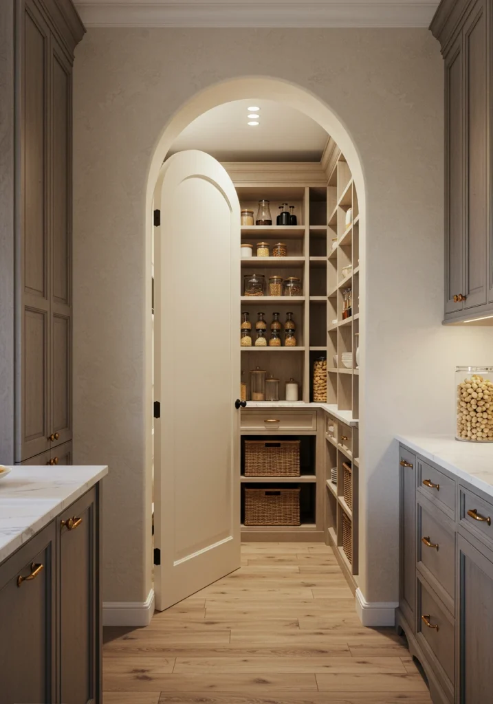 The “Secret” Cabinet Door Entry: A fun, “hidden-in-plain-sight” design where the pantry door is disguised as a large cabinet.