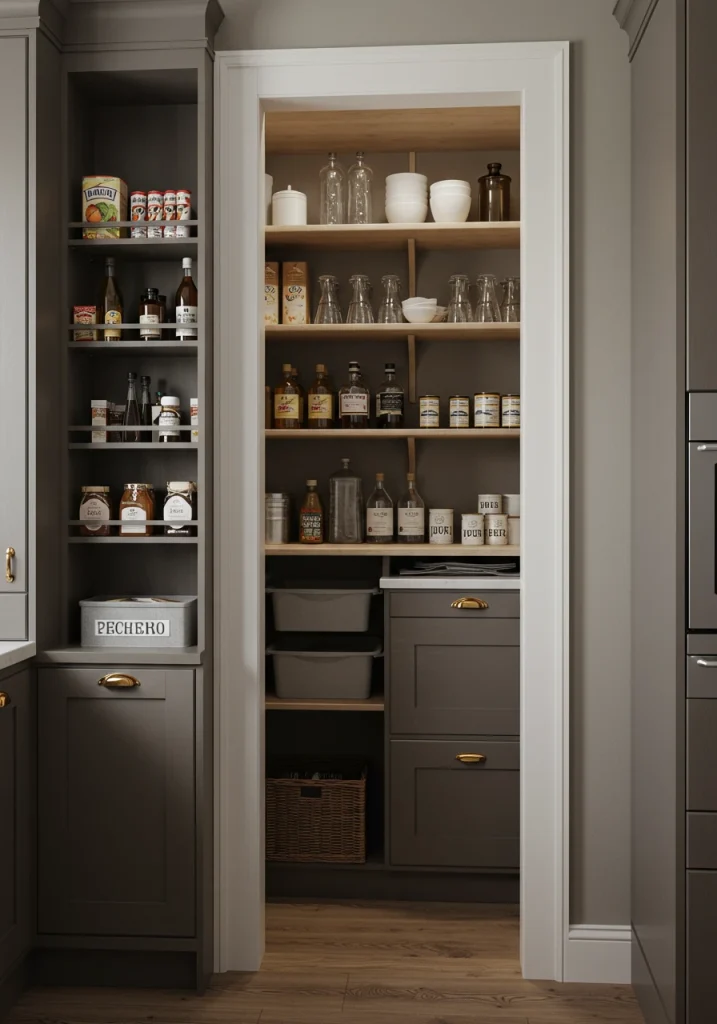The “Hidden” Pantry: Conceal the pantry entrance behind cabinet doors that match the rest of the kitchen for a seamless, secret look.