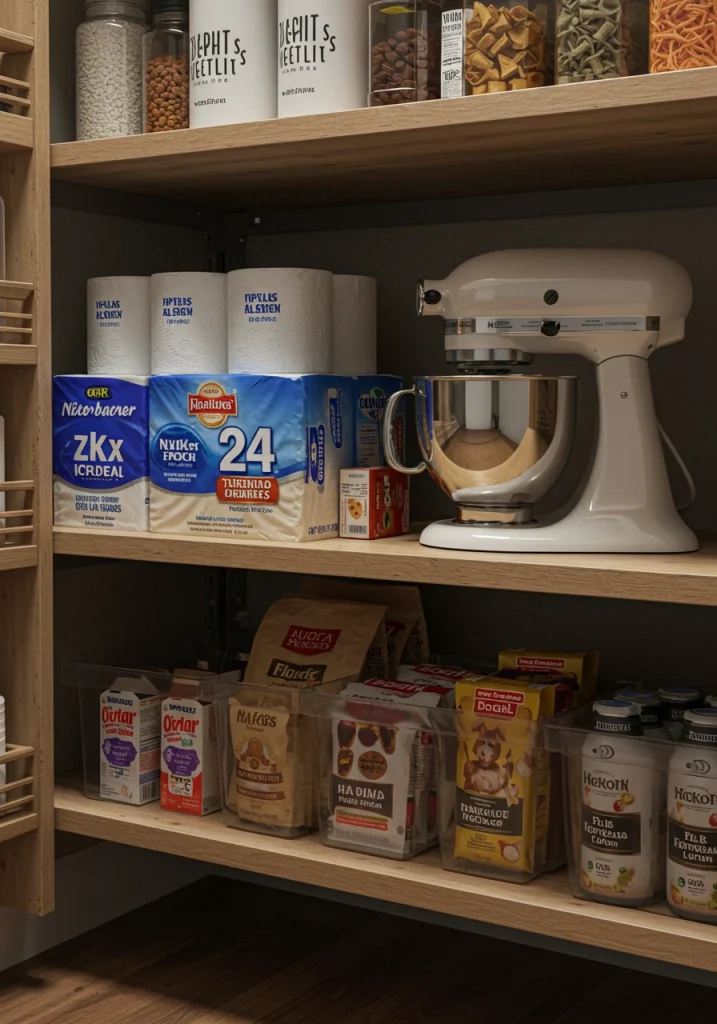 Deep Shelving for Bulk Items: Use deeper shelves (16-20 inches) on the bottom for bulk goods, paper towels, and small appliances.