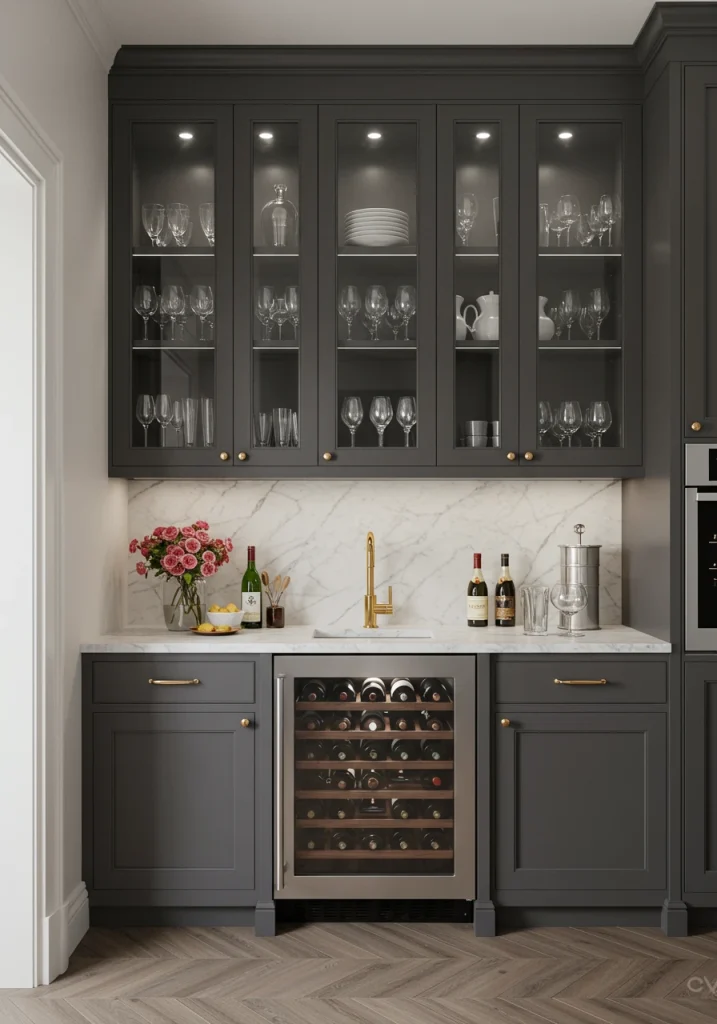 The Efficient Butler’s Pantry: A transitional space between the kitchen and dining room, often with a countertop for serving and storage for fine china.