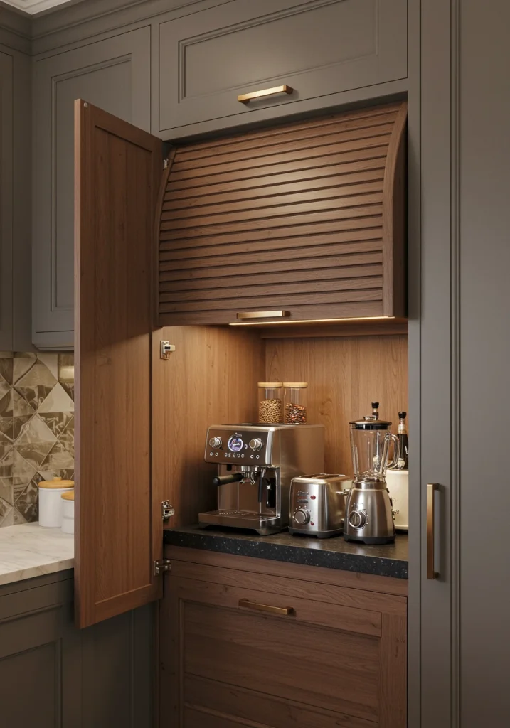 A Hidden Appliance Garage: A cabinet on the counter with a lift-up or tambour door to hide your toaster, blender, and coffee maker.
