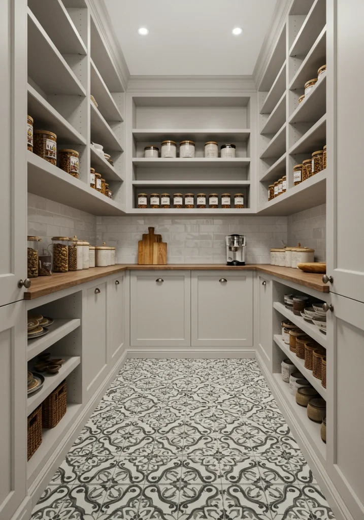 A Statement Tile Floor: A beautiful, patterned tile floor can turn a simple pantry into a design moment.