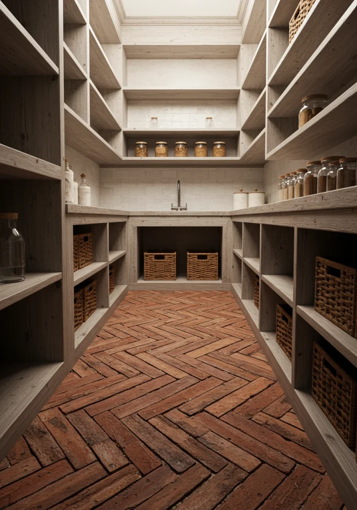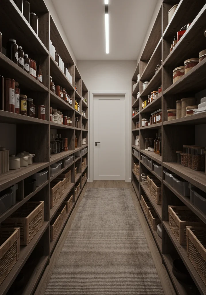 The Galley-Style Layout: Perfect for a long, narrow pantry, with shelving on two opposing walls creating a central aisle.