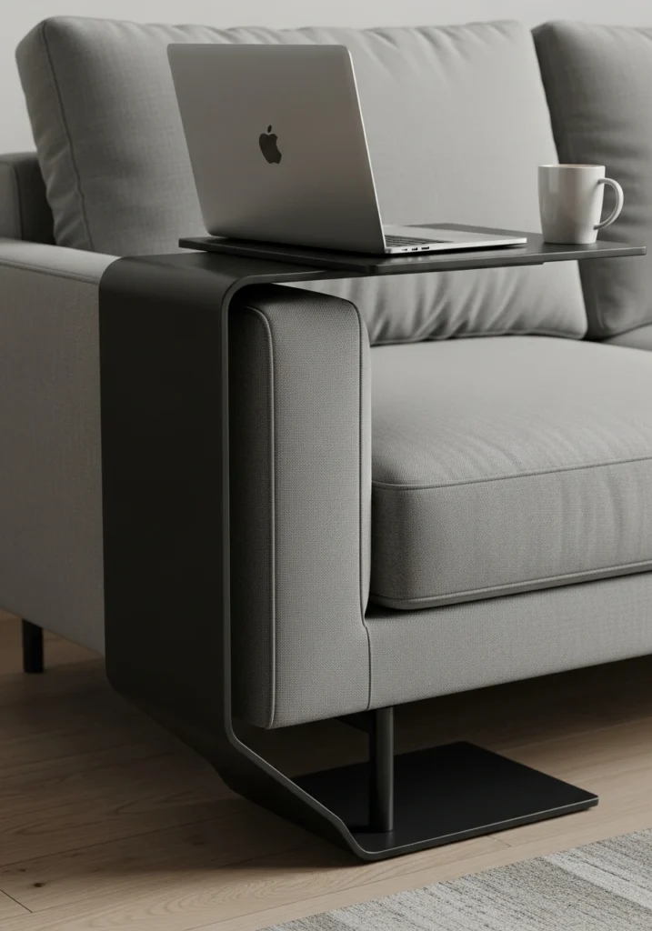 This, is, a, modern, space-saving, hero. A, “C-shaped” table, has, a, base, that, is, designed, to, slide, under the, frame, of, your, sofa, or, armchair. This, allows, you, to, pull, the, tabletop, surface, directly, over, your, lap, creating, a, perfect, “movable” spot, for, a, laptop, or, a, drink, with, a, zero, footprint.