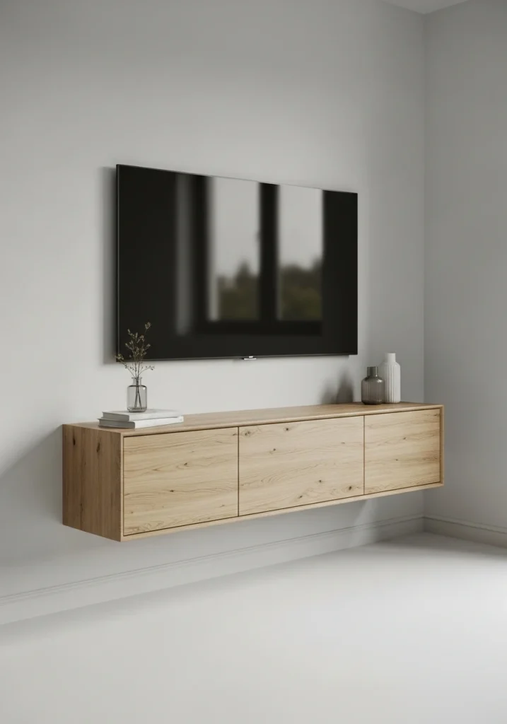 A, standard, bulky, TV, stand, can, eat, up, a, lot of, floor, space. A, “floating” media, console, is, a, sleek, set of, drawers, or, a, shelf, that, is, mounted, directly, to, the, wall. This, gets, the, entire, unit, off, the, floor, making, the, room, feel, larger, and, more, open.