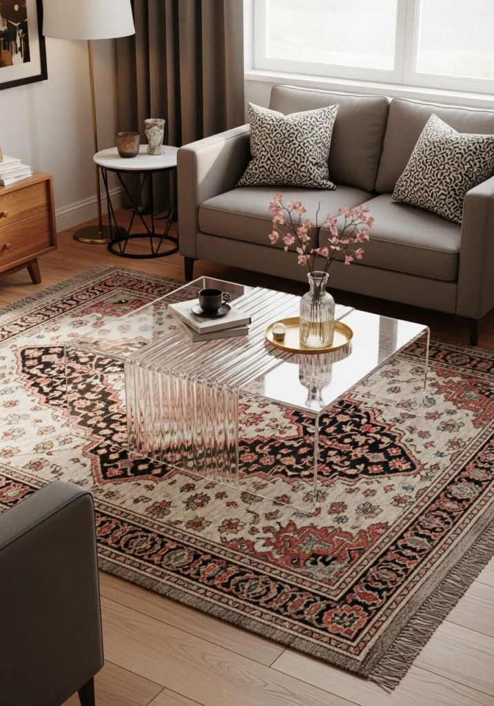 A, classic, “small-space, trick.” A, “ghost” coffee, table, made, of, clear, acrylic, or, “lucite” takes, up, zero, “visual, weight.” Because, you, can, see, right, through, it, your, eye, is, not, stopped, by, a, bulky, piece of, furniture, and, the, beautiful, pattern of, your, rug, can, shine, through.
