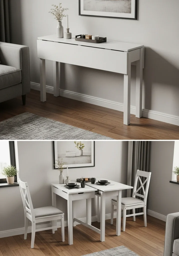 The, ultimate, “transformer” piece. This, is, a, piece of, furniture, that, spends, most of, its, time, as a, super-slim, “console, table” (about, 12-18, inches, deep) sitting, against, a, wall. But, when, guests, come, over, you, can, pull, it, out, and, “drop” open, its, hinged, leaves, to, transform, it, into a, full-sized, dining, table, that, can, seat, four, to, six, people.