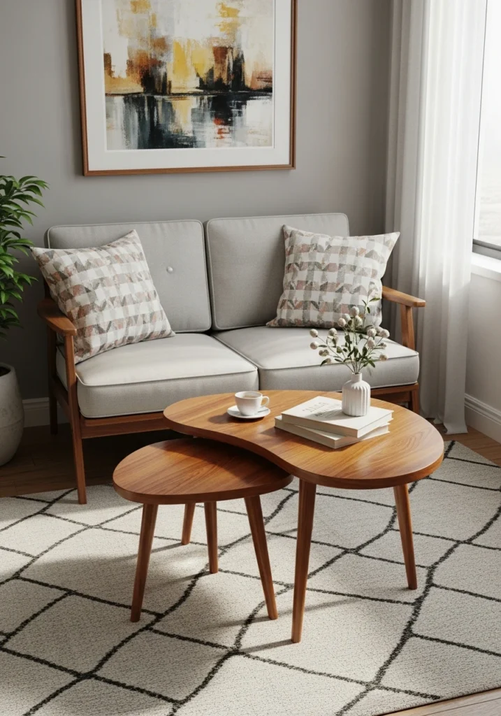 Instead of, one, large, coffee, table, a, set of, two, or, three, “nesting, side, tables” is, a, much, more, flexible, solution. They, provide, multiple, small, surfaces, that, can, be, tucked, away, into, one, small, footprint, or, pulled, out, and, spread, around, the, room, for, guests, to, use.