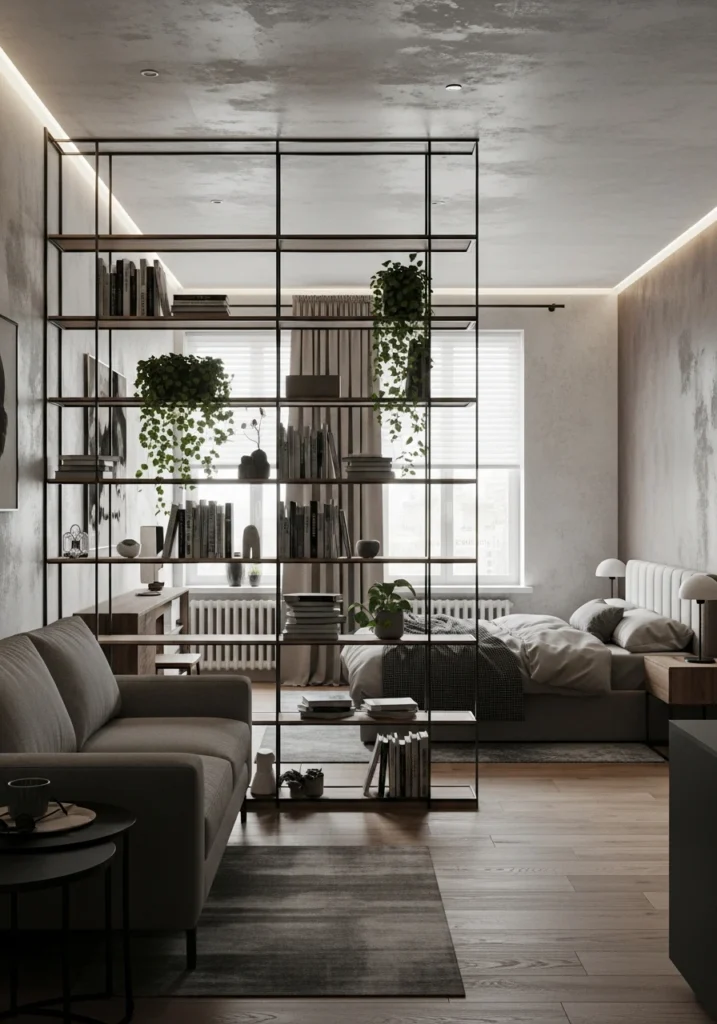 A major 2026 trend. In a studio or, small, one-bedroom, apartment, you, need, to, define, zones, without, blocking, light. Use, a, “see-through” divider, like, a, tall, open-backed, shelving, unit, (like, the, IKEA, Kallax) or, a, “slatted, wood” partition, to, create, a, “broken-plan” layout. It, separates, the, living, and, sleeping, areas, while, feeling, light, and, airy.