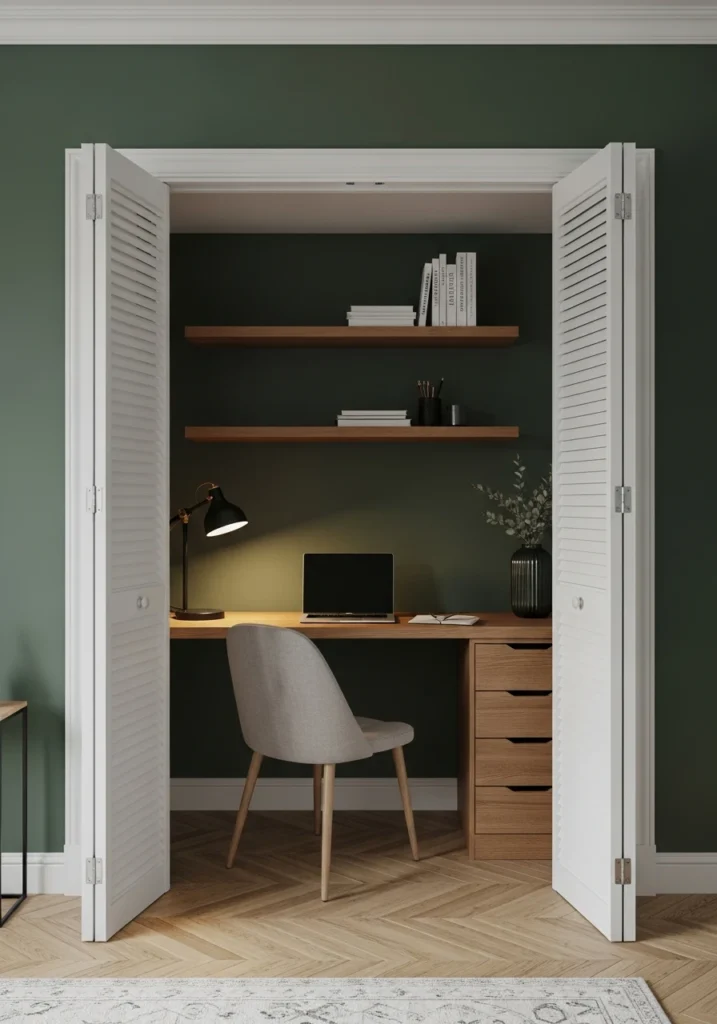 A, key, 2026, multi-use, trend. Remodel, your, living, room, closet, into a, compact, “cloffice” (closet-office). Remove, the, doors, add, a, built-in, desktop, at, counter-height, and, install, shelves, above. It, creates, a, fully, functional, home, office, with a, zero, footprint, that, you, can, hide, away.