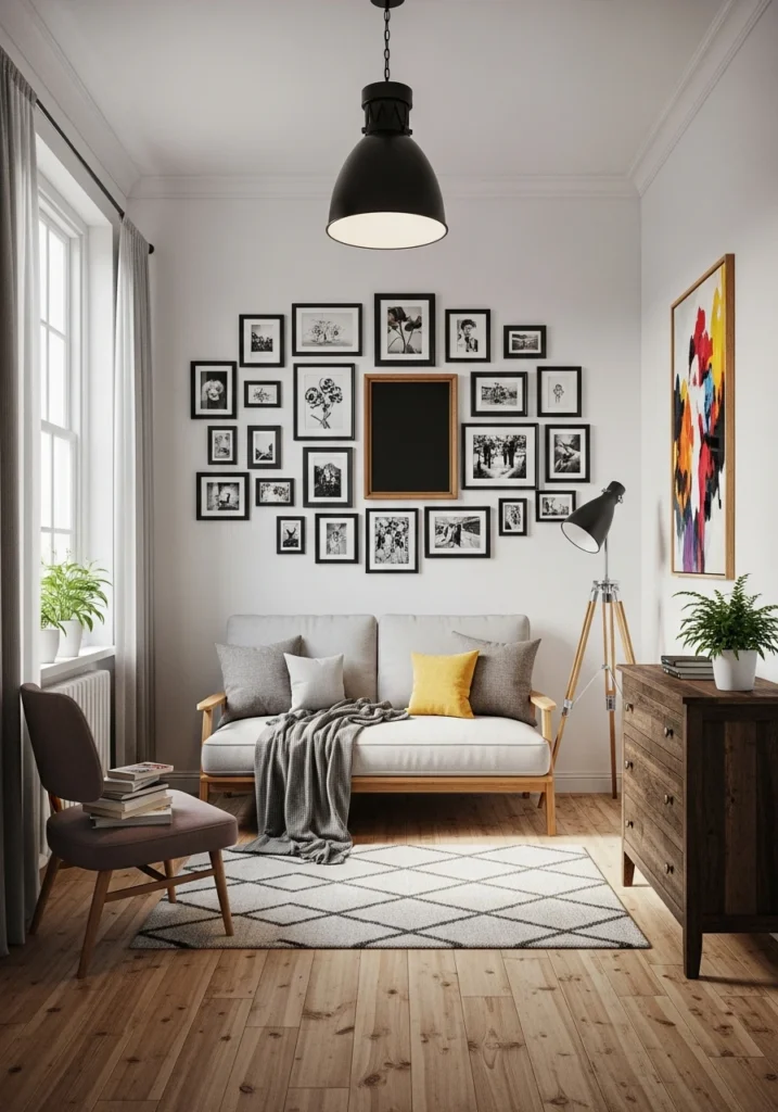 A, classic, way, to, add, huge, personality, without, using, any, floor, space. A, large, “salon-style” gallery, wall, that, goes, from, floor, to, ceiling, can, actually, make the, wall, feel, larger, and, more, dynamic. Use, simple, thin, frames, to, keep, the, look, from, feeling, too, heavy.