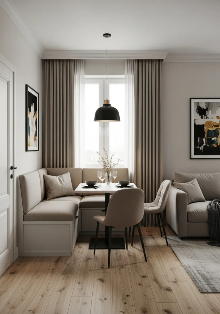 A, brilliant, remodel, idea, for, a, small, “living/dining” combo. Instead of, a, table, and, four, chairs, (which, take, up, a, huge, footprint), build, a, custom, “banquette” (or, booth) against, one, wall. This, provides, seating, for, a, table, in, half, the, space, and, you, can, build, “hidden, storage” under, the, seats.
