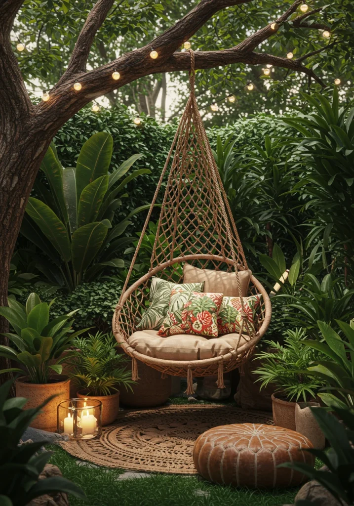 A hanging chair or a small hammock is the ultimate symbol of relaxation. It provides a gentle, soothing motion and creates a fun, playful, and incredibly comfortable spot for lounging. In a small backyard, a single hanging chair can be a fantastic, space-saving alternative to a bulky armchair, as it keeps the floor clear and has a light, airy feel.