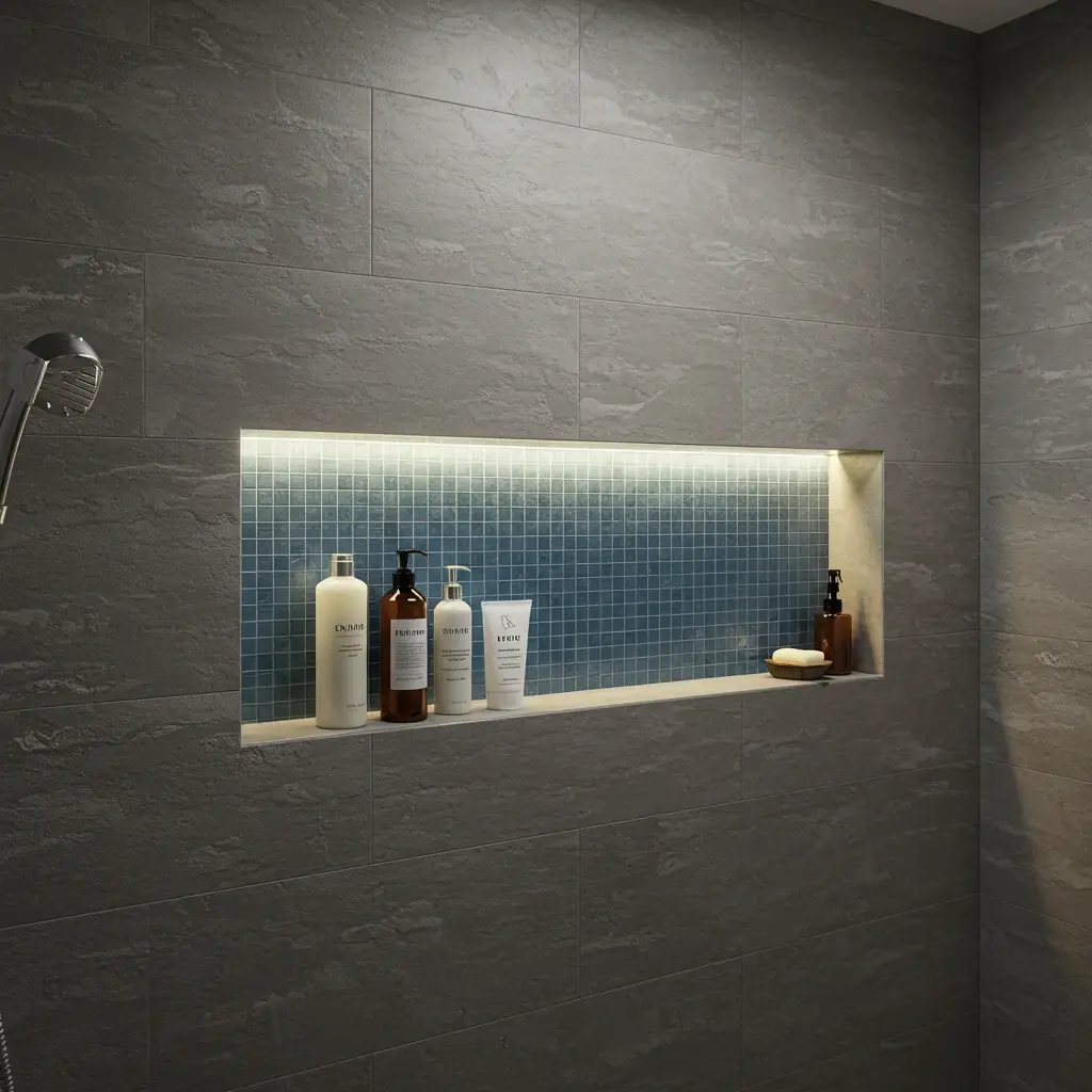 To enhance your niche, install waterproof LED lighting inside it. A backlit niche creates a beautiful, soft glow and turns a simple storage spot into a high-end architectural feature, especially effective inside a shower.