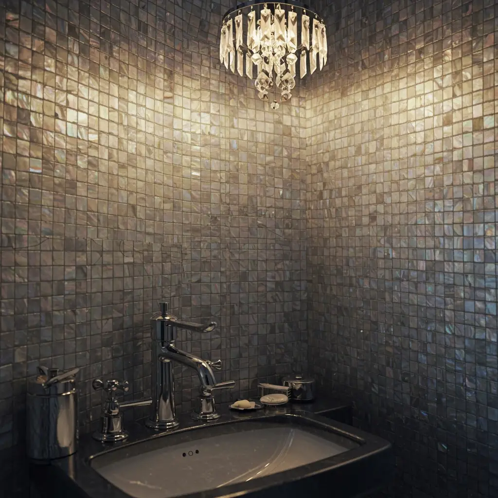 alt text: A glamorous small bathroom featuring reflective mother-of-pearl tiles and polished chrome fixtures.