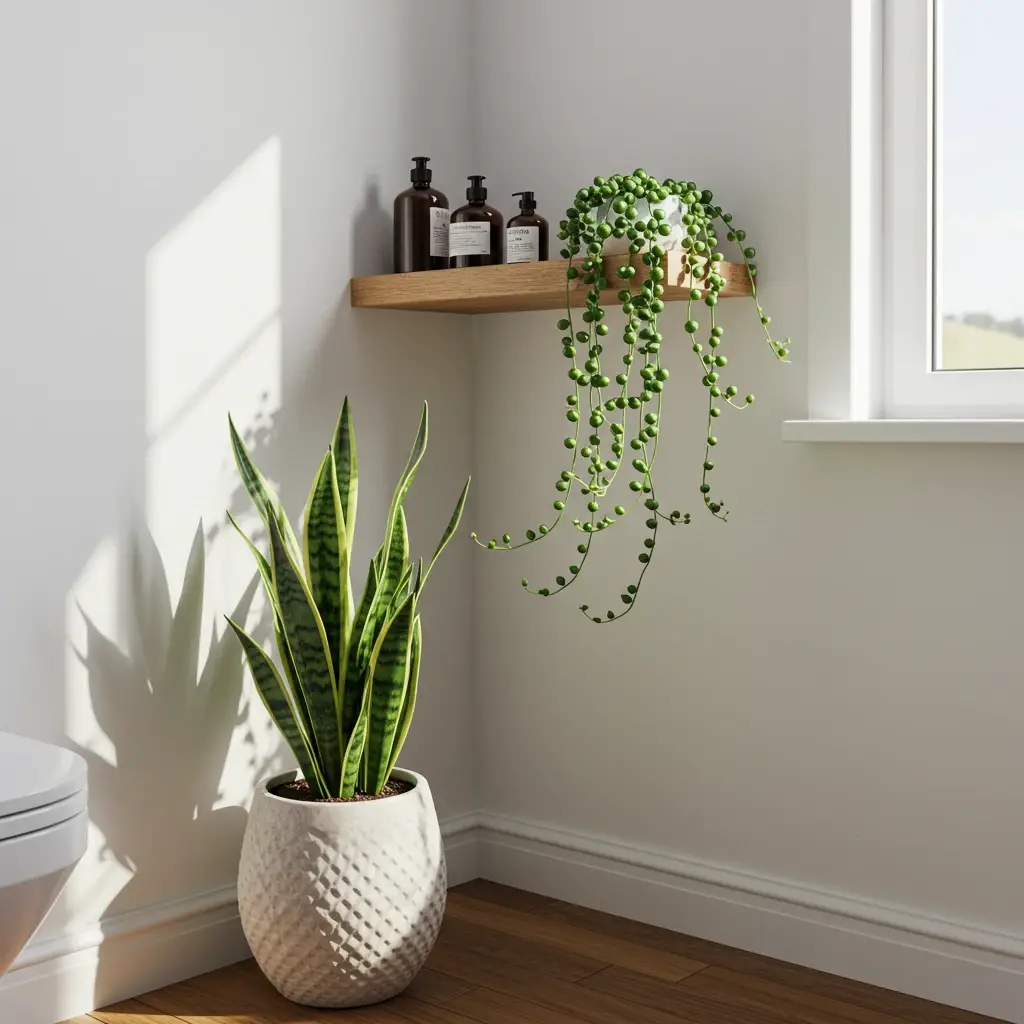 alt text: A modern bohemian small bathroom corner decorated with a snake plant and a trailing string of pearls plant.