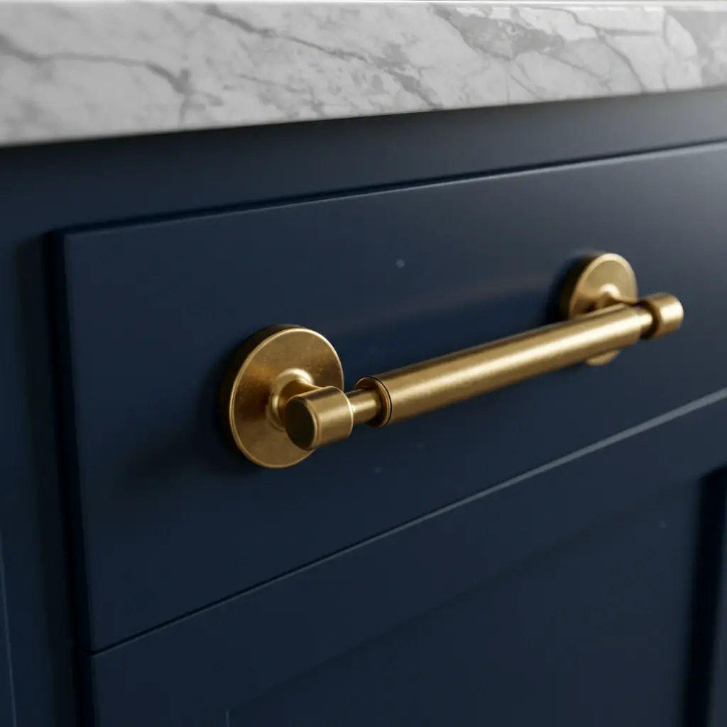 alt text: A close-up of a navy blue bathroom vanity with stylish, hexagonal brushed brass hardware.