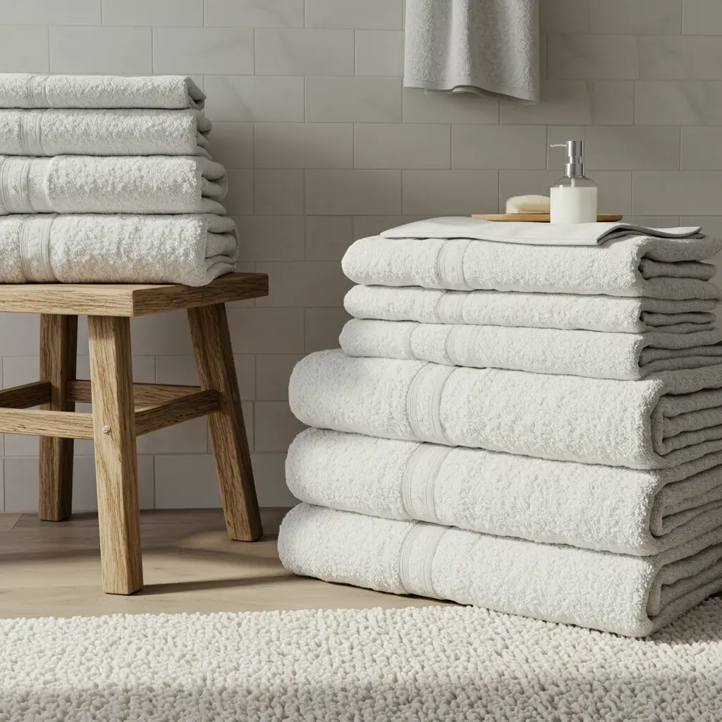 alt text: A spa-like bathroom scene with a stack of luxurious, fluffy white towels and a plush bath mat.