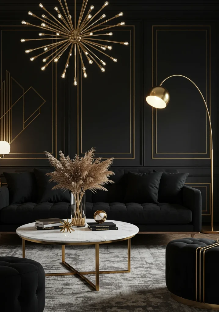 - Furniture: A sleek, black marble coffee table or a black metal floor lamp.