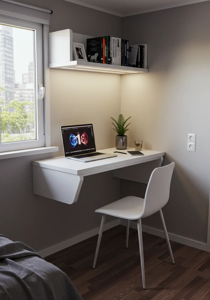 In a tiny bedroom that also needs to function as a workspace or a vanity, a simple, wall-mounted, floating desk is a brilliant, multi-purpose, and space-saving solution. A floating desk takes up zero floor space, which keeps the room feeling as open and uncluttered as possible. It can serve as a place for your laptop, a spot to do your makeup, and can even double as a nightstand if it’s placed next to your bed.