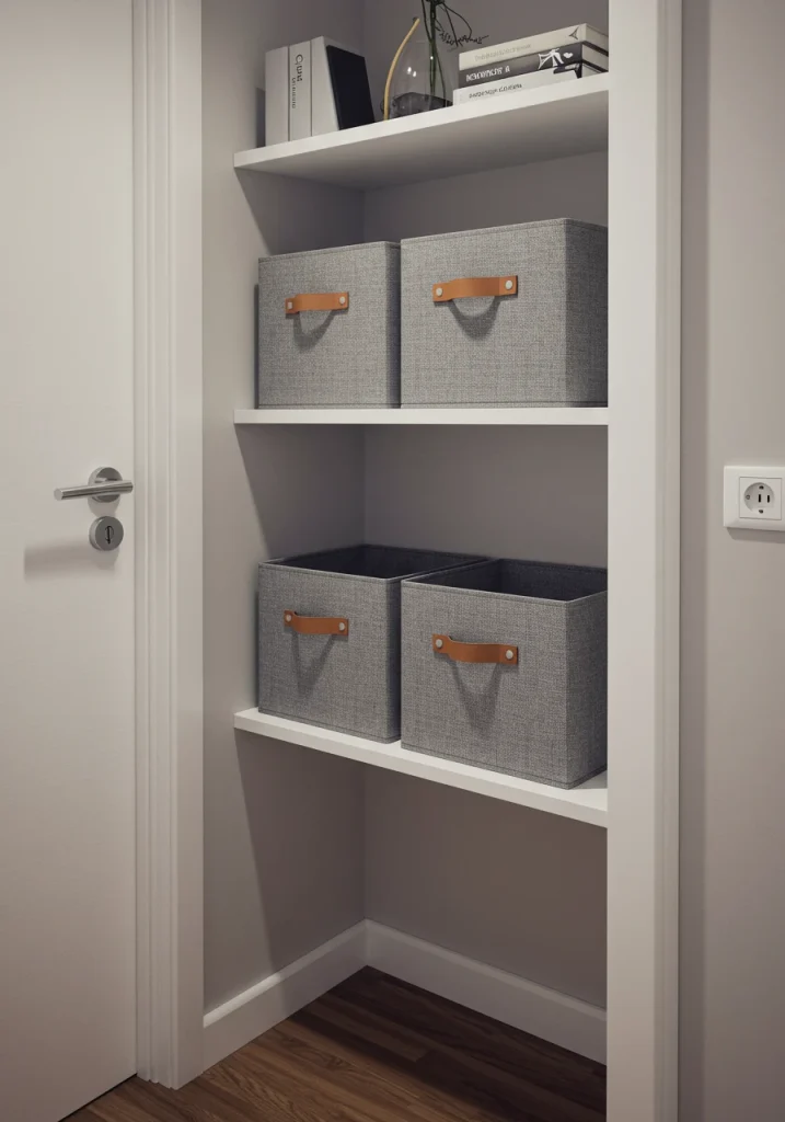 For an enhancement, find a set of beautiful, lidded, decorative boxes that fit the shelf perfectly. This will keep your storage looking neat and tidy and will hide the contents from view.