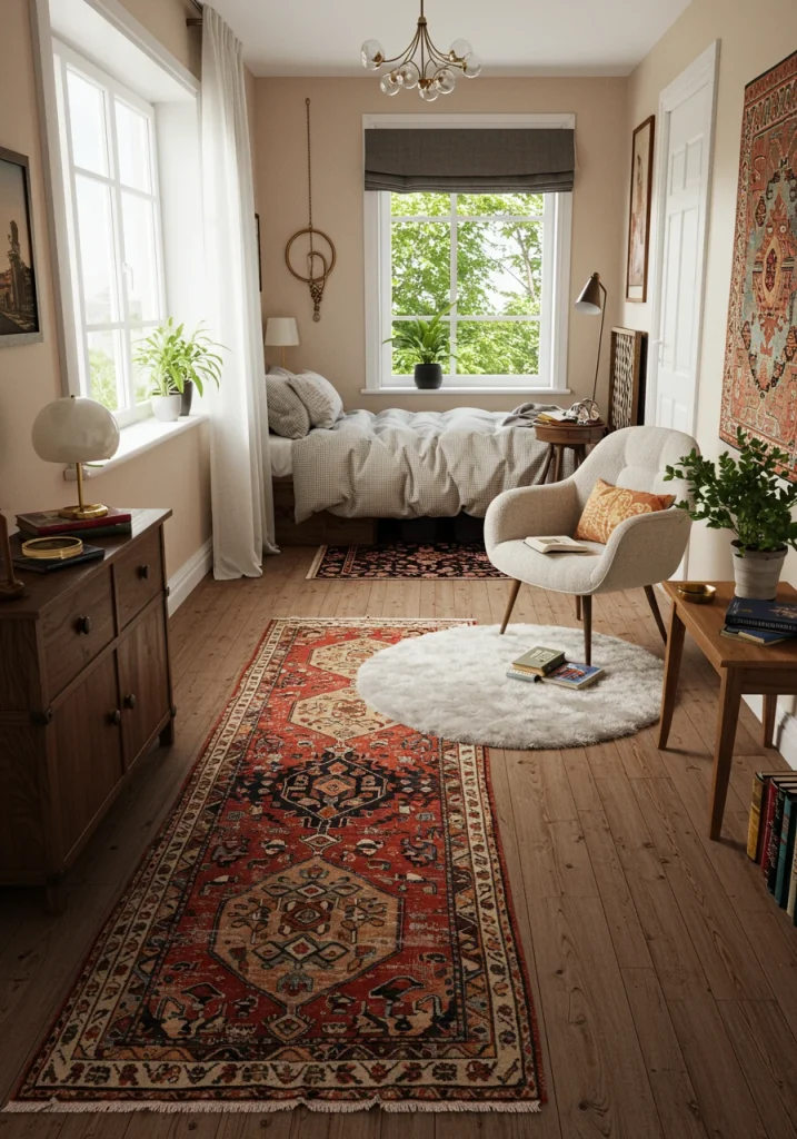 Even in a tiny, single-room bedroom, you can use rugs to create the illusion of different, functional zones. This is a clever designer trick that can make your space feel more organized and a bit larger. For example, a small, rectangular runner next to your bed can define a “waking up” zone, while a small, round, plush rug in a corner can define a “reading nook” zone under an armchair.