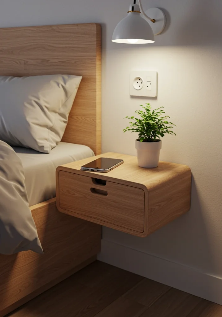 • Floating Nightstand: A small, wall-mounted drawer or box is perfect for hiding away clutter.