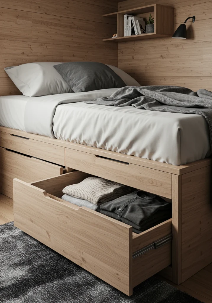 In a tiny bedroom, your bed takes up the most real estate, so it’s essential to make it work as hard as possible. Choosing a bed frame that has built-in storage drawers underneath is one of the smartest, most functional decisions you can make. This is a huge amount of wasted space in a standard bed frame, and a storage bed allows you to reclaim it for clothes, shoes, or extra bedding.