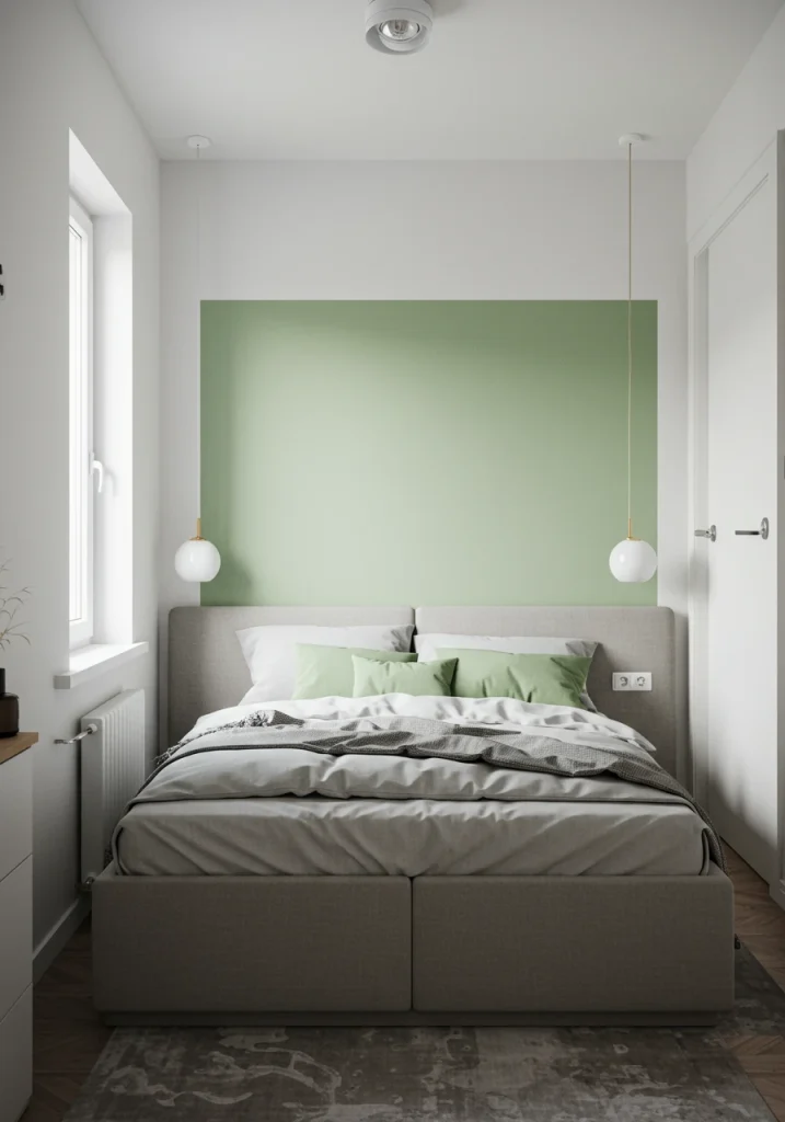 • A Painted “Headboard”: Paint a simple, graphic shape—like a rectangle or a half-circle—on the wall behind your bed to create a “virtual headboard.”