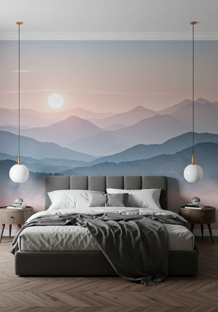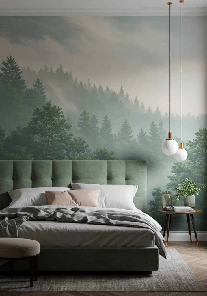 For a truly immersive and enchanting accent wall, a large-scale, mural-style wallpaper is a breathtaking choice. Unlike a small, repeating pattern, a mural wallpaper depicts a single, large image, turning your entire wall into a stunning piece of art. This is a very on-trend way to add a huge amount of drama, personality, and a custom, high-design feel to your bedroom.