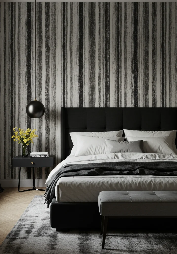 For a look that is bold, graphic, and full of energy, a high-contrast, black and white wallpaper is a fantastic choice for a bedroom accent wall. The bold, graphic nature of a black and white pattern can be a stunning and sophisticated focal point, and it provides a versatile backdrop that works with almost any accent color.