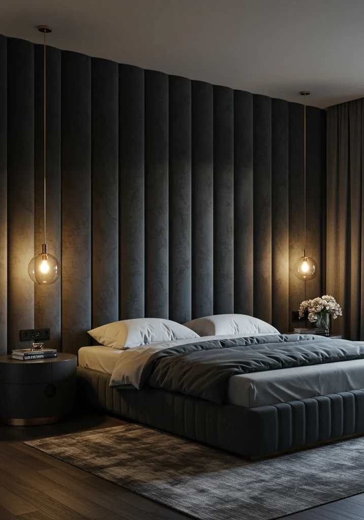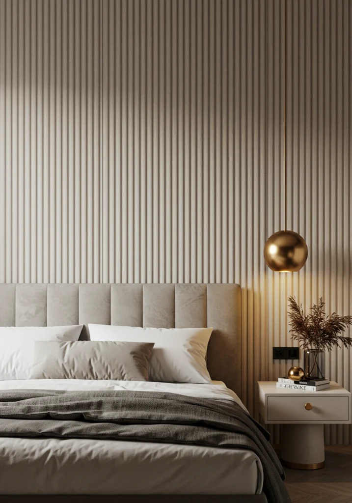 A major trend in high-end, contemporary design is the use of fluted or reeded textures. A fluted accent wall, made from a series of narrow, convex, half-round wood moldings, can add an incredible amount of subtle, sophisticated, and architectural texture to your bedroom. The beautiful, repeating, vertical lines create a stunning play of light and shadow that is both calming and visually interesting.