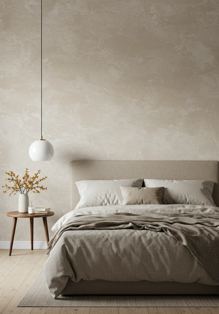 For a look that is soft, earthy, and full of subtle, textural movement, a limewash paint finish is a stunning and very on-trend choice for a bedroom accent wall. Limewash is a traditional, natural paint that is made from slaked lime and natural pigments. When applied with a brush in a cross-hatch pattern, it creates a beautiful, cloud-like, slightly streaky finish with a soft, chalky, matte texture.