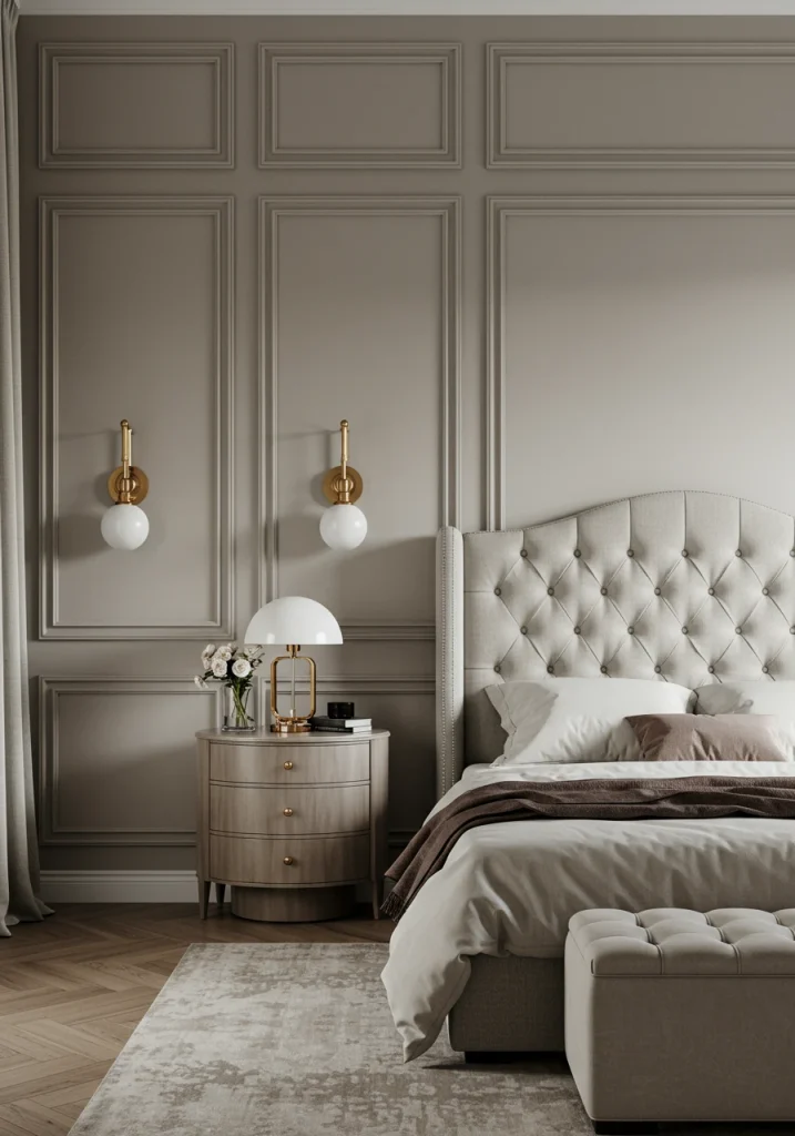 To add a sense of history, sophistication, and architectural character to a plain bedroom, there is nothing more effective than adding decorative molding or trim to your accent wall. As your inspiration photo with the tufted headboard beautifully illustrates, simple, applied molding can transform a flat, boring wall into a feature with depth, shadow, and a timeless, elegant feel.