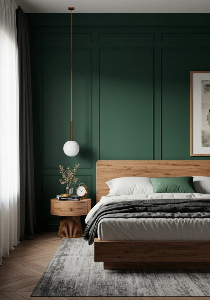 alt text: A modern bedroom with a bold, painted accent wall in a deep green color.