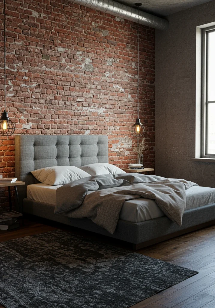 - Balance with Softness: It’s essential to pair the hard, rough texture of the brick with plenty of soft, cozy textiles, like a tufted headboard, a plush rug, and soft, layered bedding.