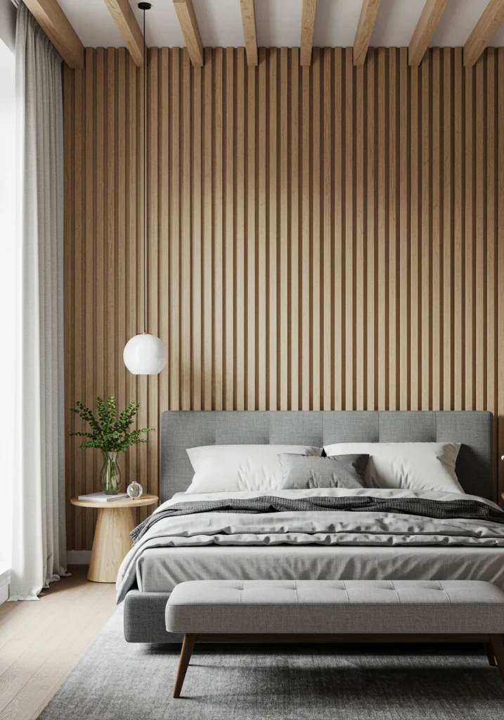A wall of vertical wood slats is a very popular and sophisticated trend for a modern accent wall. This feature adds a huge amount of warmth, texture, and a clean, linear, architectural element to a bedroom. The repeating, vertical lines of the wood slats can draw the eye upward, making the ceiling feel higher, and the natural wood tone adds a beautiful, organic, spa-like feel.