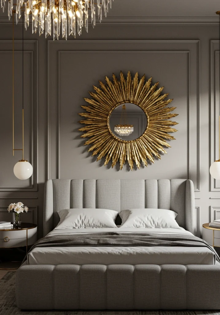 To make a bedroom feel larger, brighter, and more glamorous, a large, statement mirror is a fantastic accent feature. A mirror with a beautiful, interesting frame can serve as a stunning piece of wall art in its own right, with the added benefits of bouncing light around the room and creating an illusion of depth.