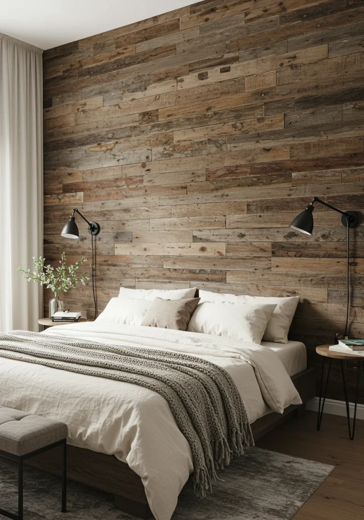 - Balance is Key: Pair the rustic wood wall with simple, soft, neutral-colored bedding (like cream or white linen) to let the texture of the wood be the star.