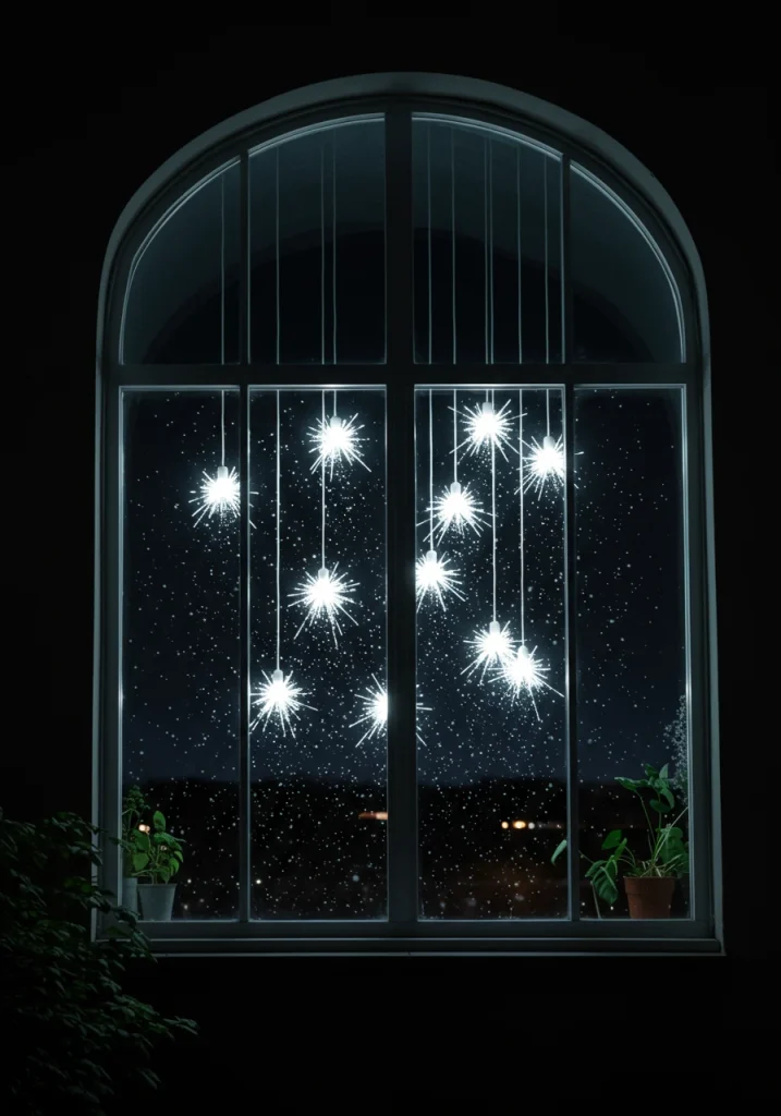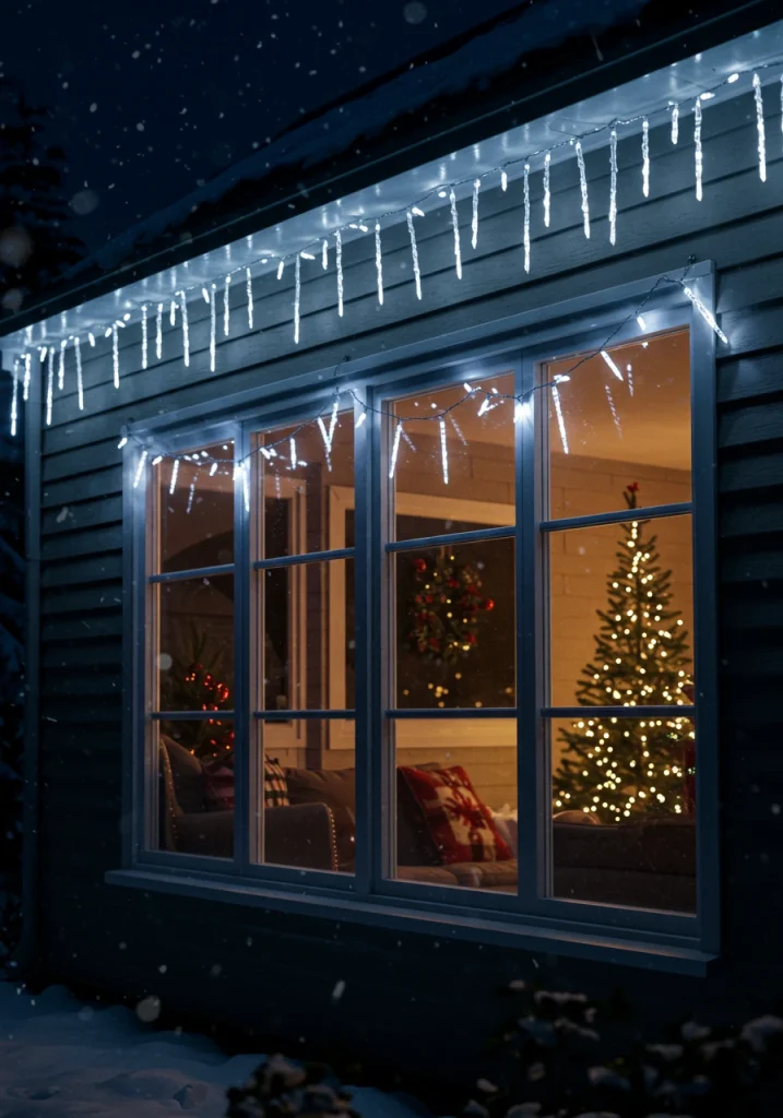For a beautiful, wintery, and slightly whimsical look, hang icicle lights from the top of your window frames. Icicle lights are designed with multiple, hanging strands of varying lengths, which perfectly mimic the look of natural, glistening icicles. This is a classic and very popular way to add a touch of winter wonderland magic to your window displays.