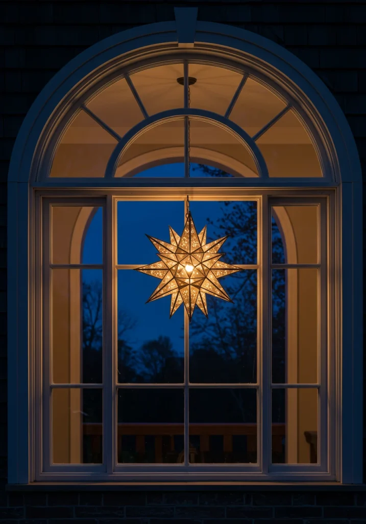 For an enhancement, hang a cluster of three, identical, Moravian stars at slightly different heights in a single, large window. The repetition of the beautiful, geometric shape in a cluster is a very high-impact and professionally styled look.