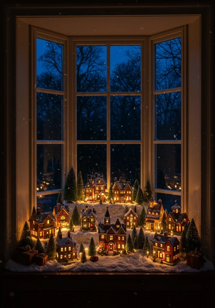 A collection of miniature, lighted, Christmas village houses is a classic and deeply nostalgic decoration. While they are often displayed on a mantel, a beautiful and charming idea is to create your Christmas village display on a wide windowsill or on a console table placed directly in front of a main window.