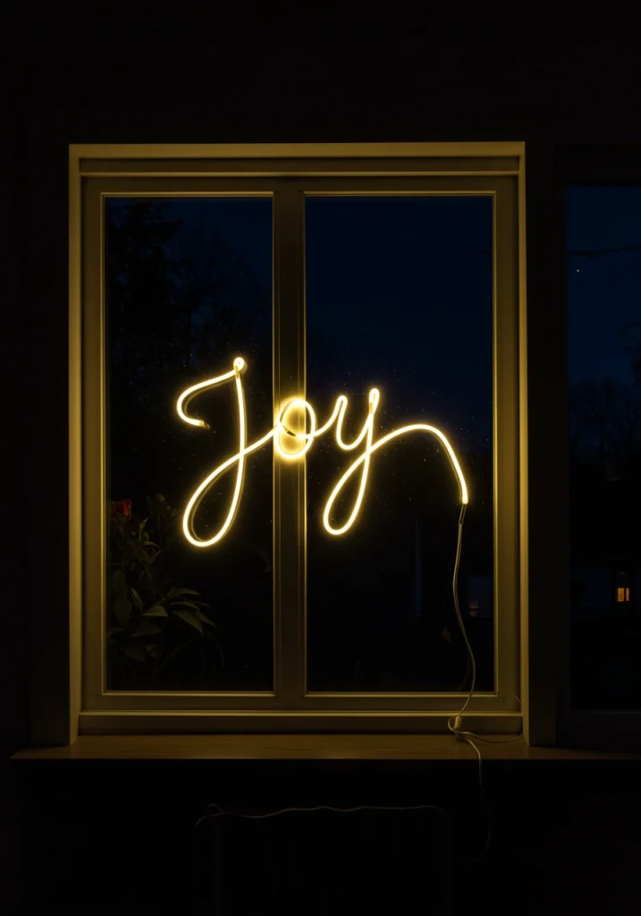 For a look that is modern, playful, and completely custom, use a flexible, LED rope light to create a piece of festive, “word art” in your window. You can spell out a classic, holiday message, like “Joy,” “Peace,” or “Noel,” or a more modern and playful phrase. The glowing, script-like quality of the rope light has a very cool, neon-sign-like effect.